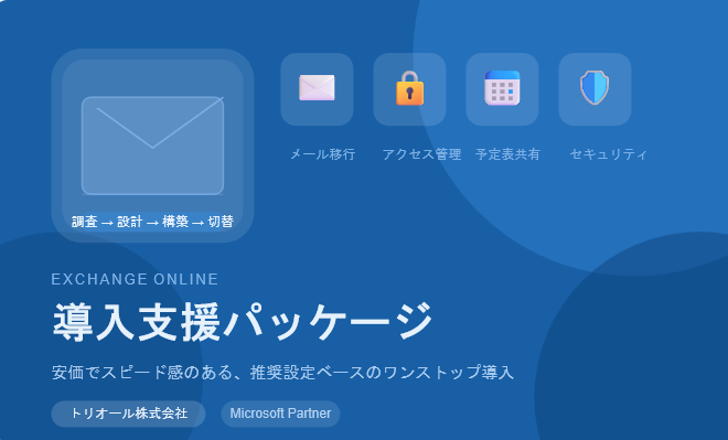 Exchange Online 導入支援パッケージをリニューアルしました 2024.06.03 トピックス トリオール株式会社(本社:東京都あきる野市/代表取締役:三瓶義雄)は、Microsoft 社 Exchange Online の導入支援作業をパッケージ化した 「Exchange Online 導入支援パッケージ」をリニ…
