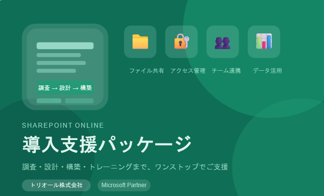 SharePoint Online サイト導入支援パッケージをリニューアルしました 2025.02.04 トピックス トリオール株式会社(本社:東京都あきる野市/代表取締役:三瓶義雄)は、Microsoft 社 SharePoint Online の導入支援作業をパッケージ化した 「SharePoint Online サイト導入支援パッ…